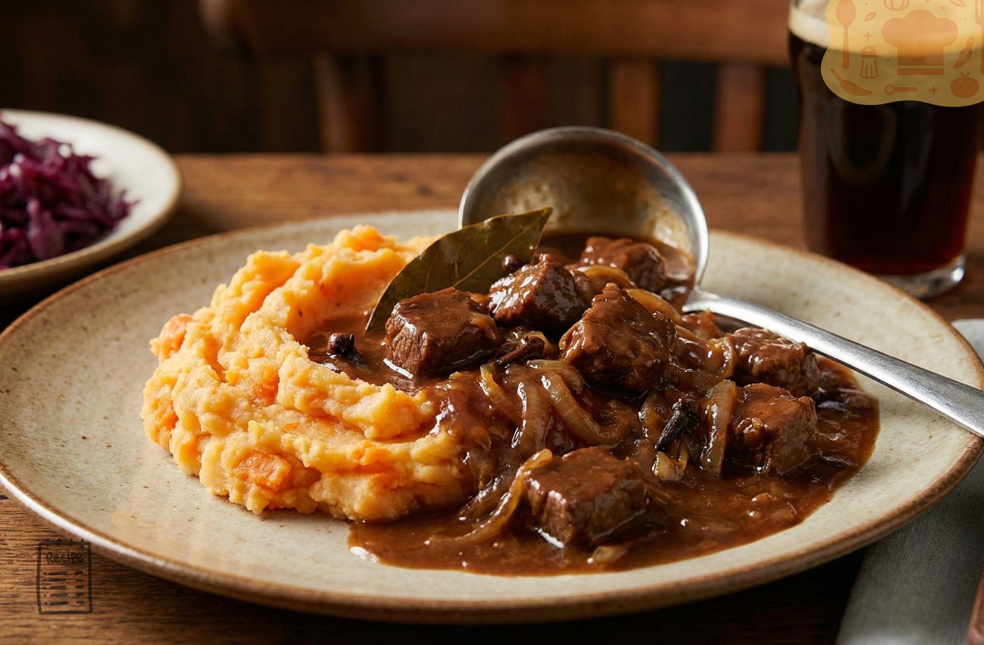 De geur van sudderend vlees en gestoofde uien vult het huis en nodigt uit om te genieten van een lange, ontspannen maaltijd. Dit gerecht leent zich uitstekend om van tevoren te bereiden, zodat de smaken goed kunnen intrekken. Het serveren in diepe borden met een royale lepel hachee erover maakt het een feestelijke stamppot die iedereen zal waarderen.